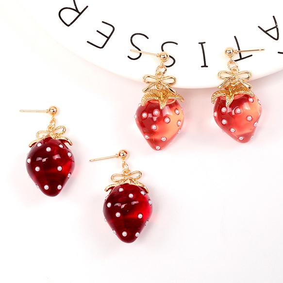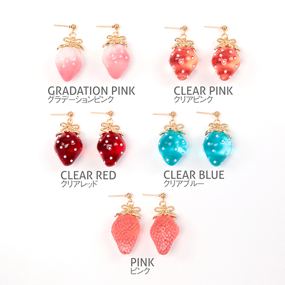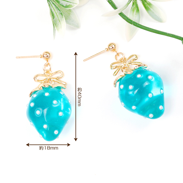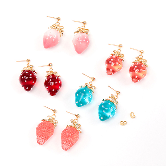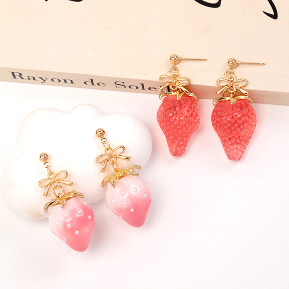 卸売いちごのピアス 完成品 耳元に揺れるイチゴピアス メタルリボンパーツ付き 一粒苺ピアス 約18×40mm(1ペア)