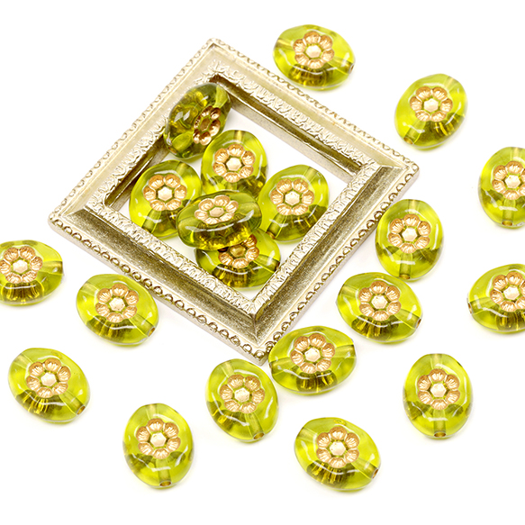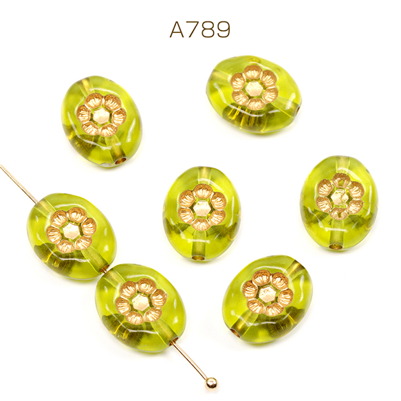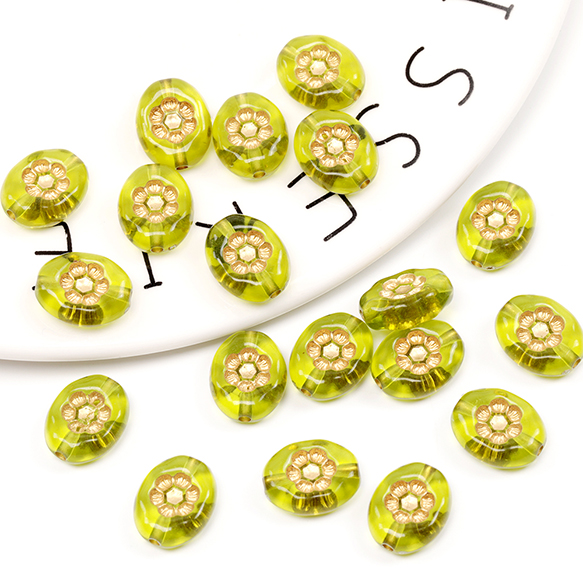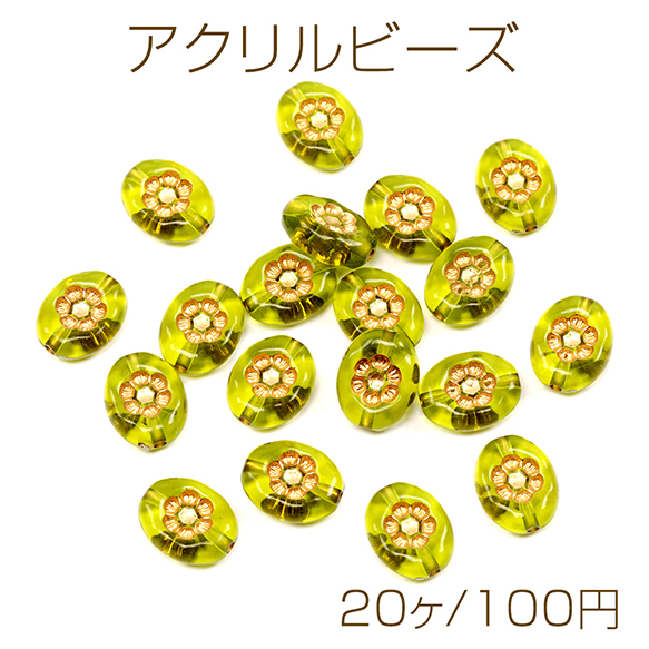 アクリルビーズ フラワー模様入り アンティーク調ビーズ チェコ風ビーズ 縦穴 オーバル型 約11×14mm(20ケ)