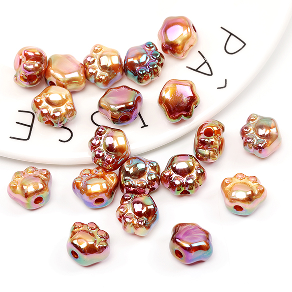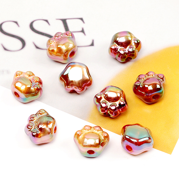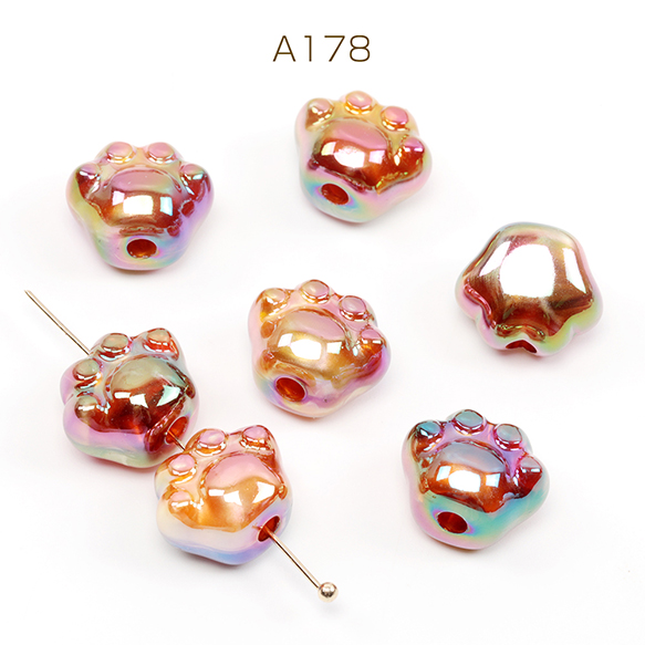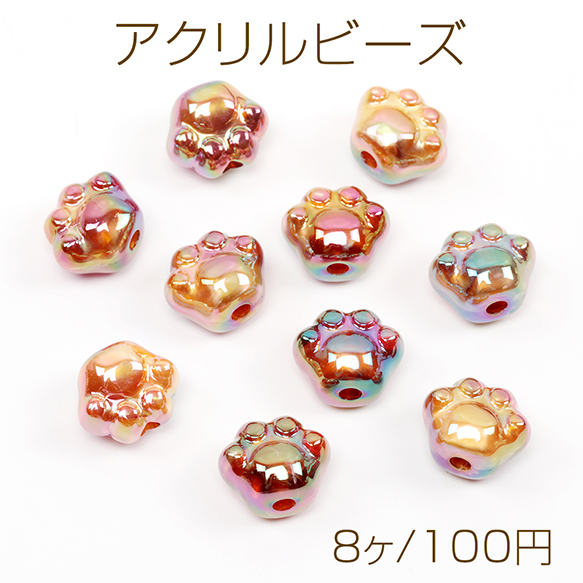 アクリルビーズ 猫の肉球 電気メッキビーズ オーロラ加工 縦穴あり 約14×18mm(8ケ)