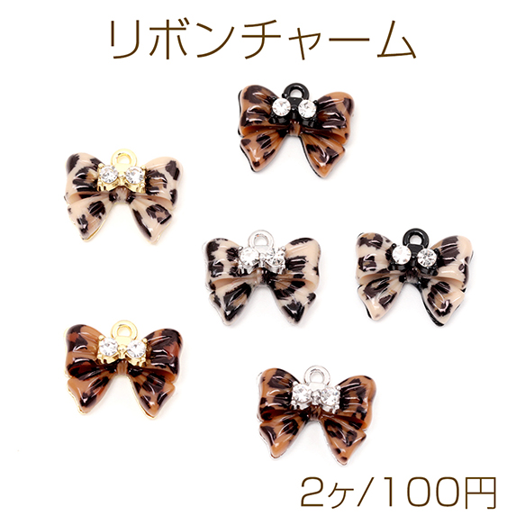 リボンチャーム ストーン付きりぼんチャーム レオパード ヒョウ柄チャーム 1カン付き 全6色 約14×17mm (2ヶ)