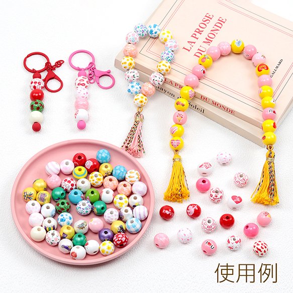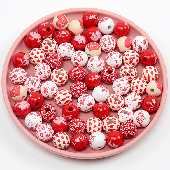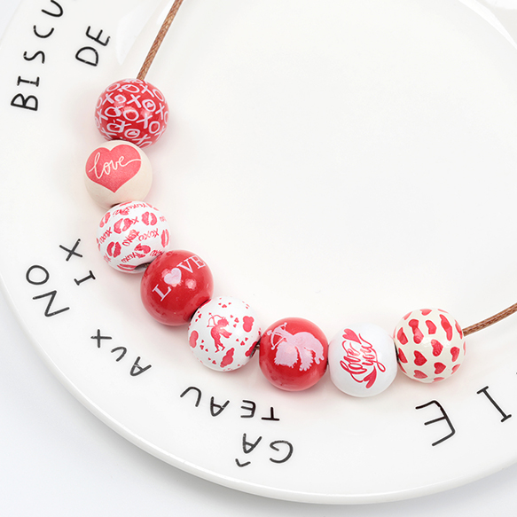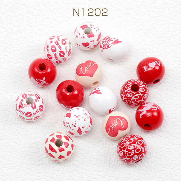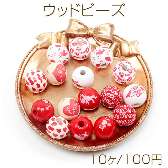 ウッドビーズ 丸玉 バレンタイン ハート 縦穴あり ラウンドウッドビーズ 約16㎜ 穴約4㎜(ランダム10ヶ)