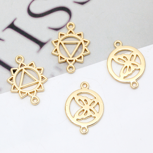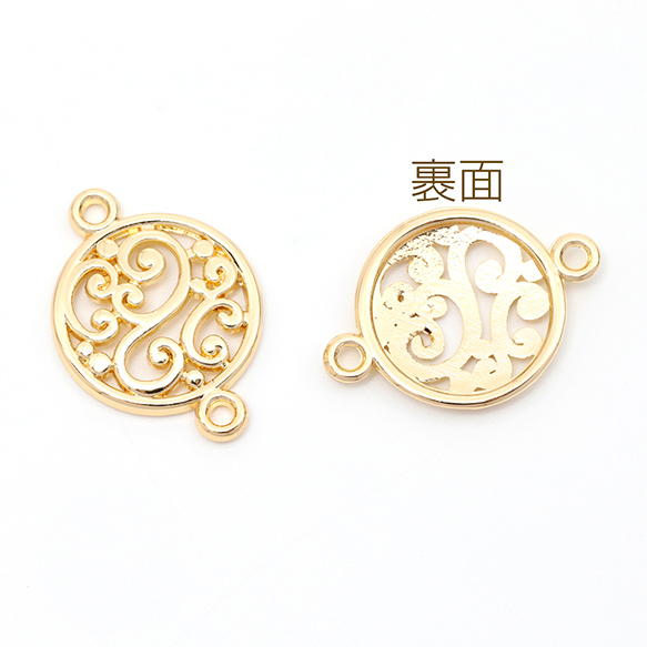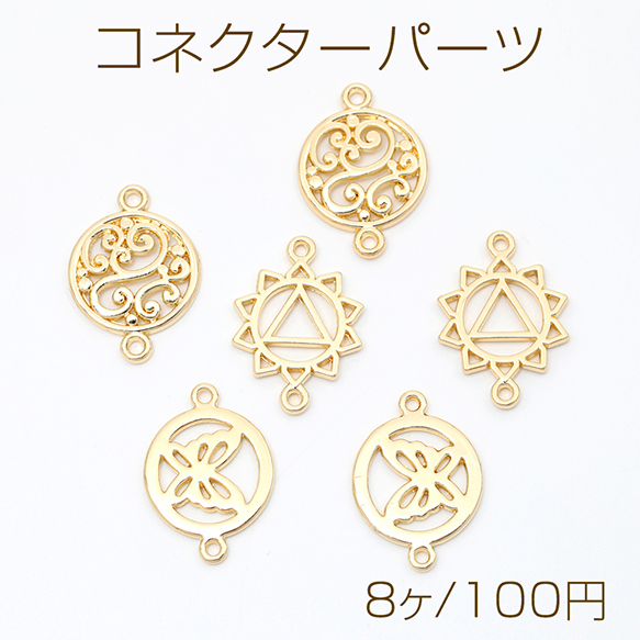 コネクターパーツ 透かしチャーム 円型 ラウンド型 つなぎパーツ 接続金具 上下2カン付き ゴールド 全3種(8ヶ)
