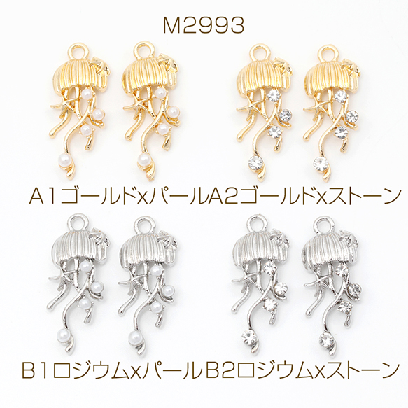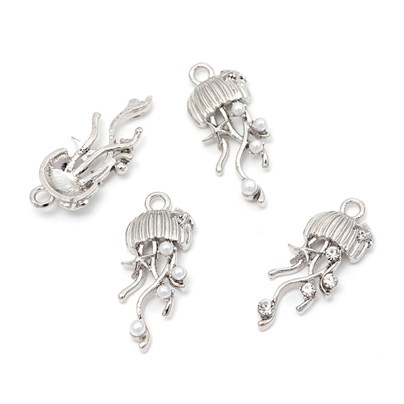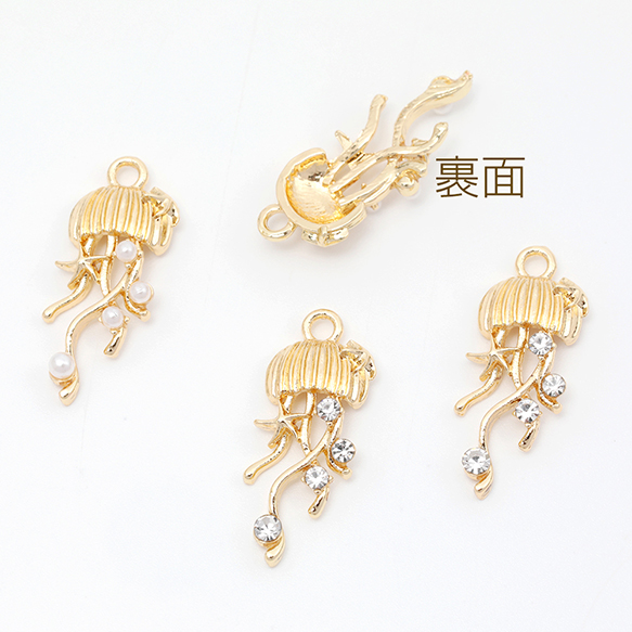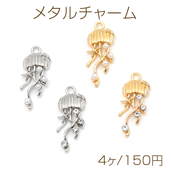 メタルチャーム クラゲ ガラスストーン付き パール付き 合金製 約10×24mm(4ヶ)