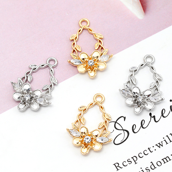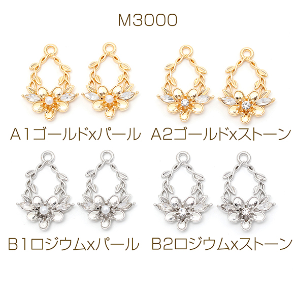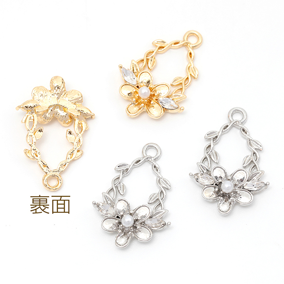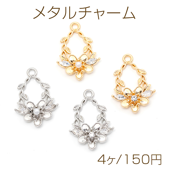 メタルチャーム フラワー ガラスストーン付き パール付き 合金製 約15×22mm(4ヶ)