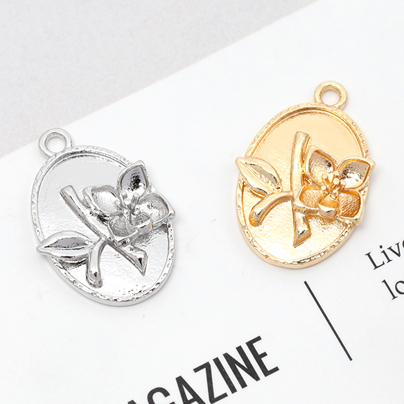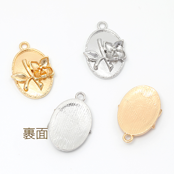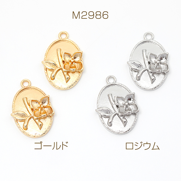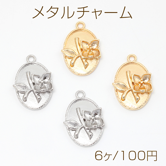 メタルチャーム 楕円型 フラワー ガラスストーン付き パール付き 合金製 約15×22mm(6ヶ)