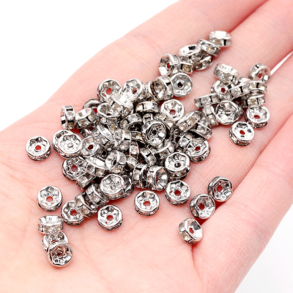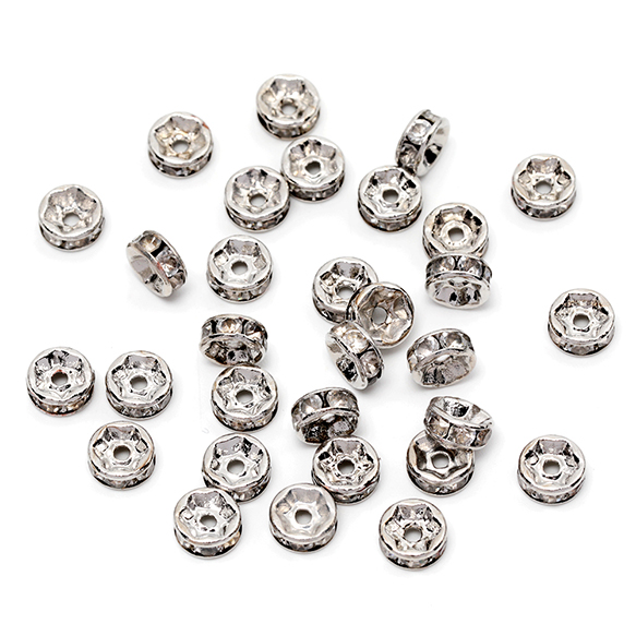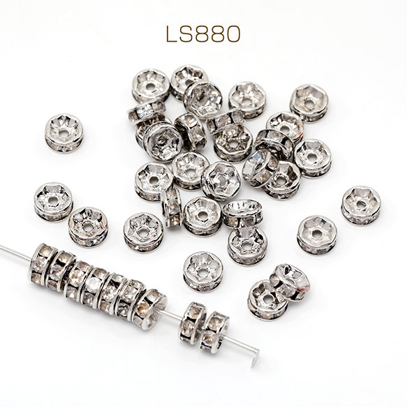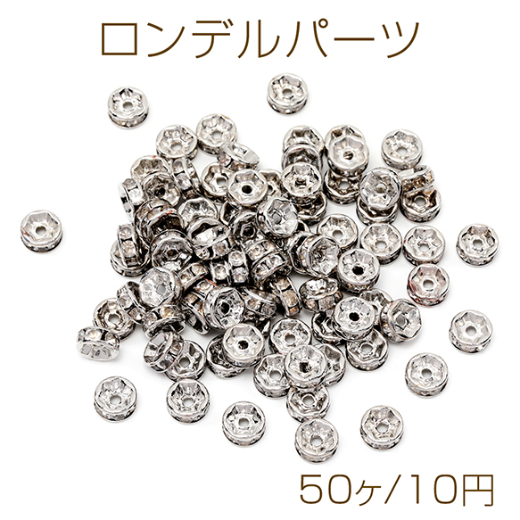 ロンデルパーツ ストーン付 スペーサービーズ メタルビーズ ロジウム 2.5×6mm(約50ヶ)