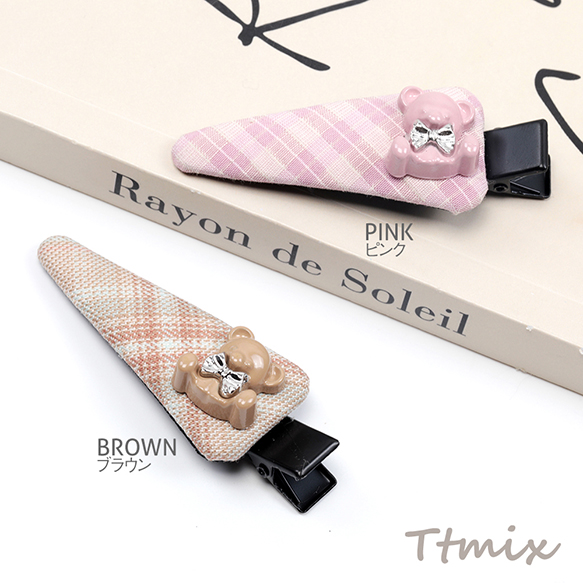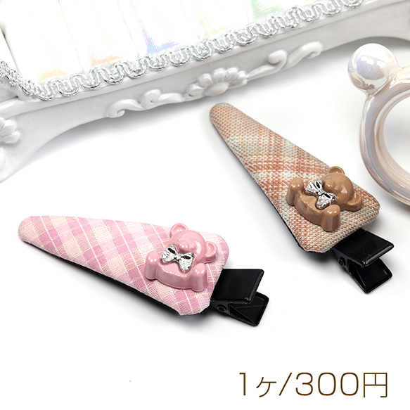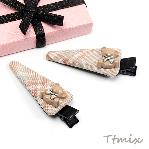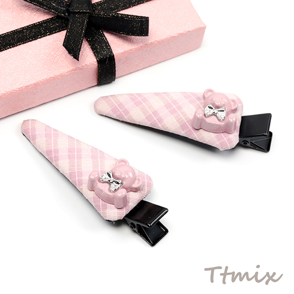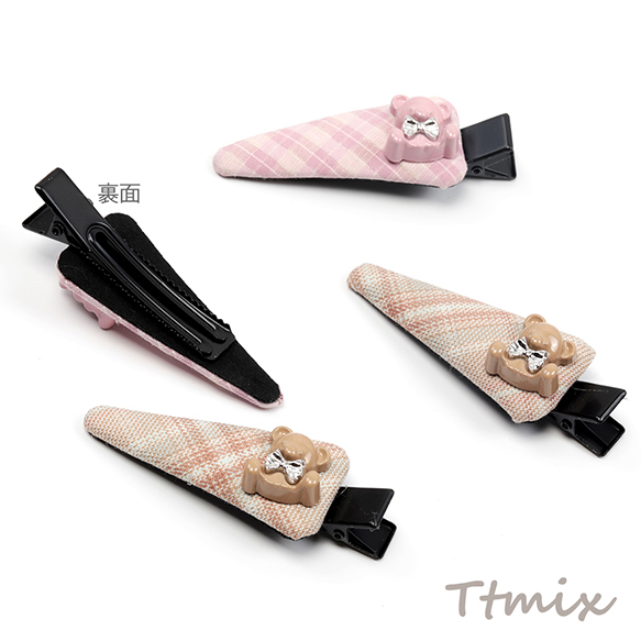 ヘアクリップ 鉄製 チェック柄 リボン クマのビーズ付き 髪飾り 髪留め 約2.5×6.5cm(1ヶ)