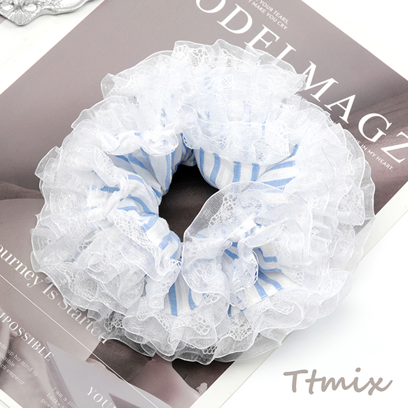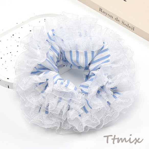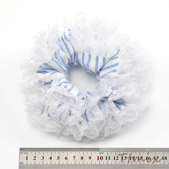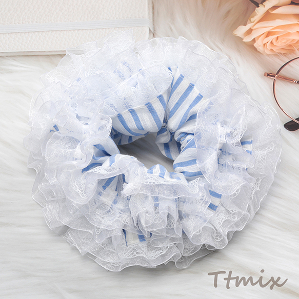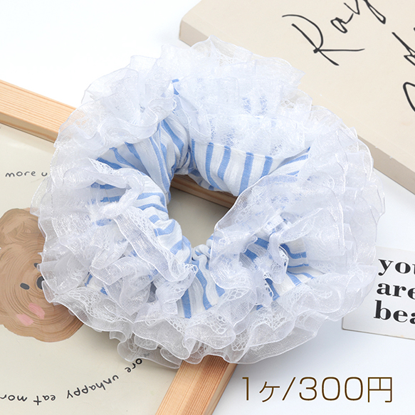 シュシュ ストライプ柄レース付き 上品 可愛い ヘアゴム ヘアアクセサリー 髪留め 髪飾り(1ヶ)