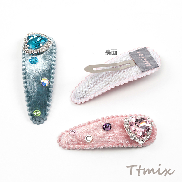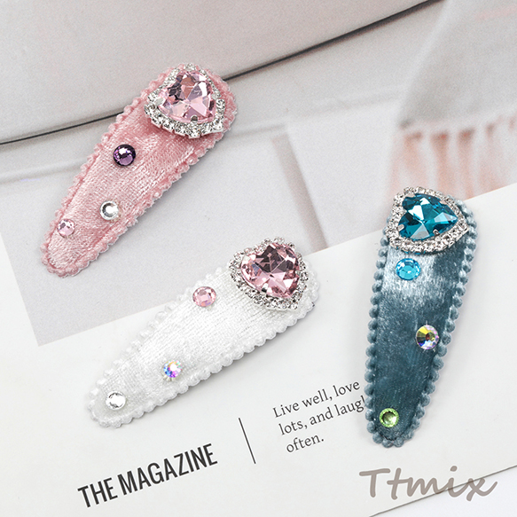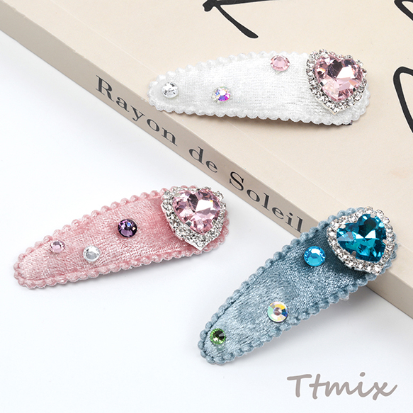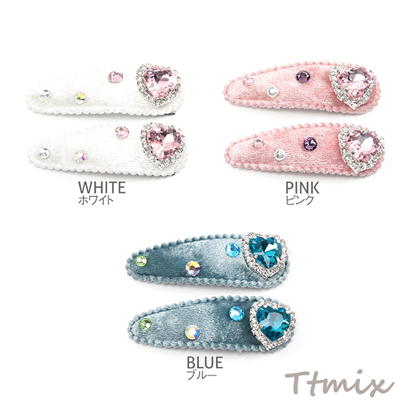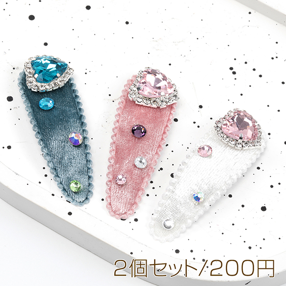 ビジューヘアクリップ ビジュー付き ベロア素材 パッチンピン サイドクリップ ホワイト ピンク ブルー 全3色 2個セット