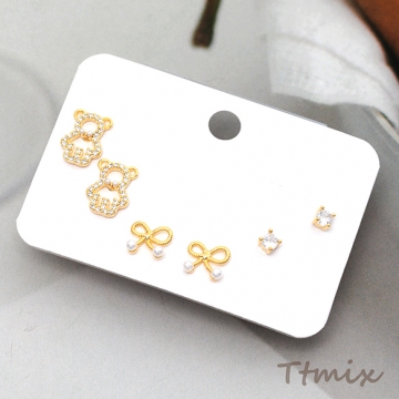 デザインピアス リボンピアス 高品質 ジルコニア ミニ リボン クマ シルバーポスト 銅製 約8×11mm(3ペア/セット)