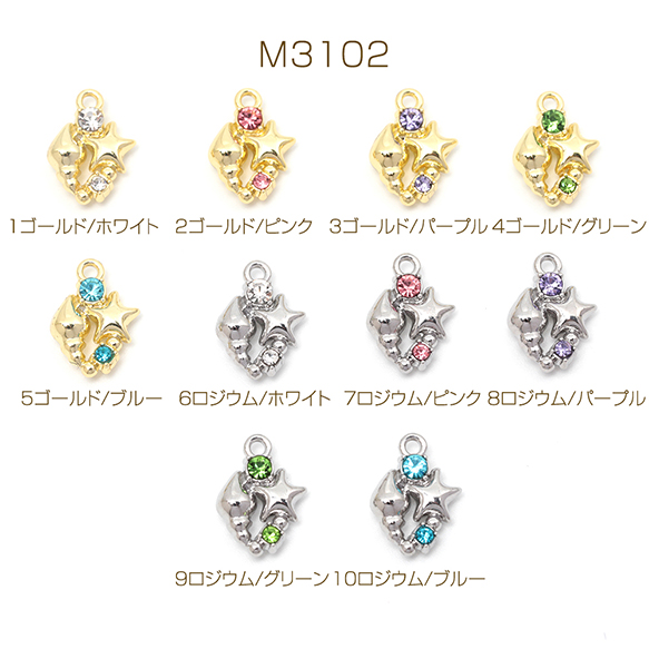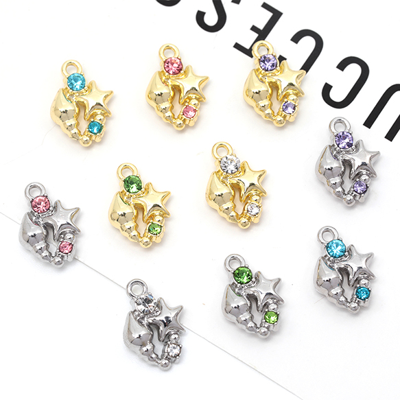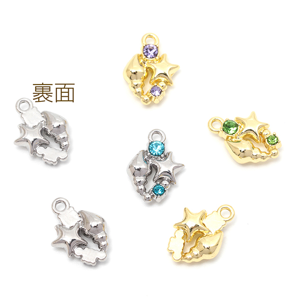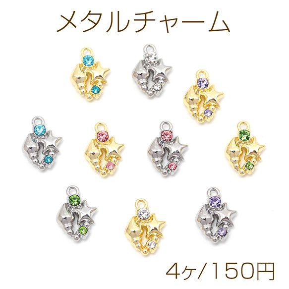 メタルチャーム ヒトデ&巻貝 石付き ペンダントパーツ 合金製 約11×15mm(4ヶ)