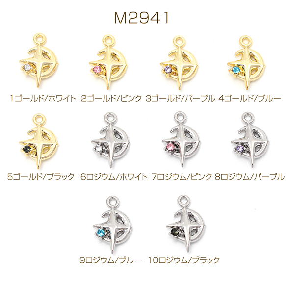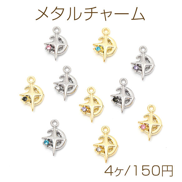 メタルチャーム 星&月 石付き ペンダントパーツ 合金製 約11×16mm(4ヶ)
