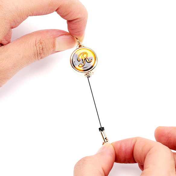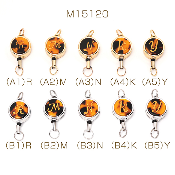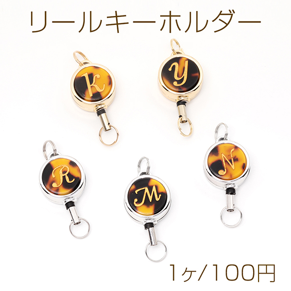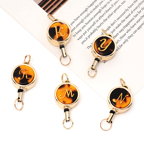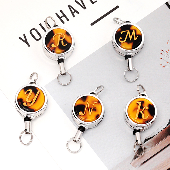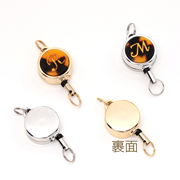 リールキーホルダー イニシャル刻印プレート付き マーブル模様 リールストラップ キーリール 伸びる 約21×50mm(1ヶ)