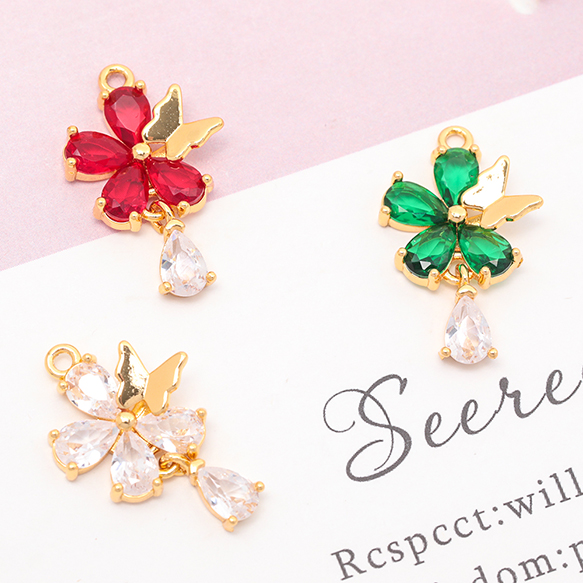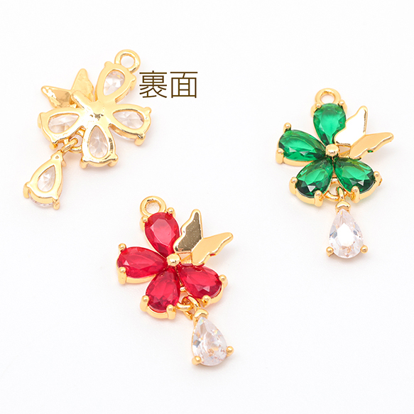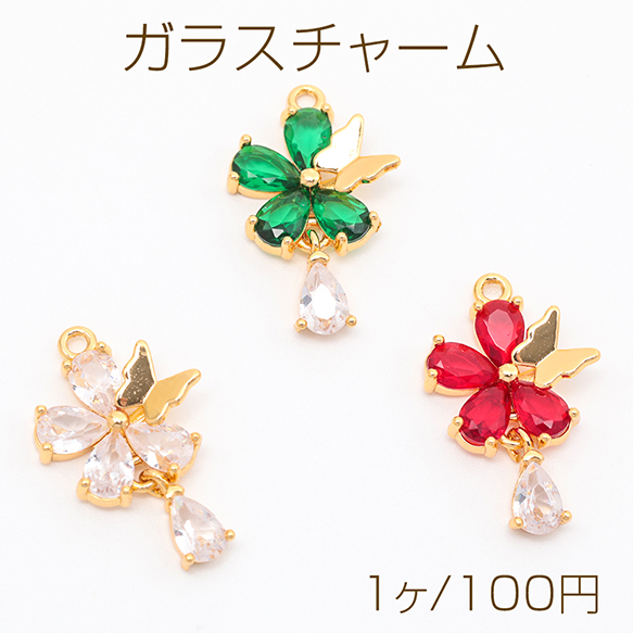 ガラスチャーム フラワー 蝶々 揺れるしずく ストーン付き 可愛い メタルチャーム 約14×23mm(1ヶ)