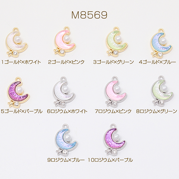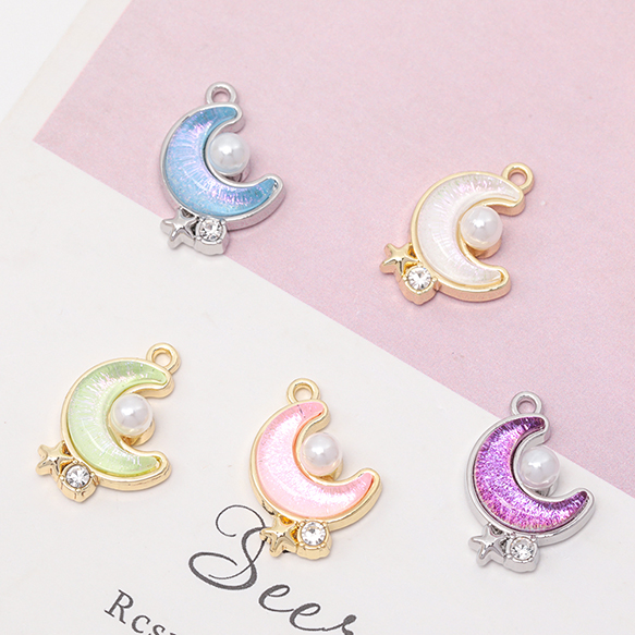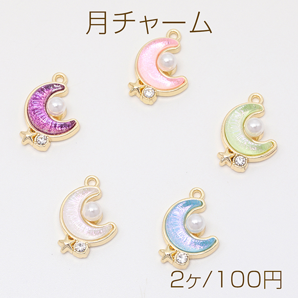 月チャーム 三日月 星 ABSパール ストーン付き 半面 宇宙チャーム メタルチャーム 約12×18mm(2ヶ)