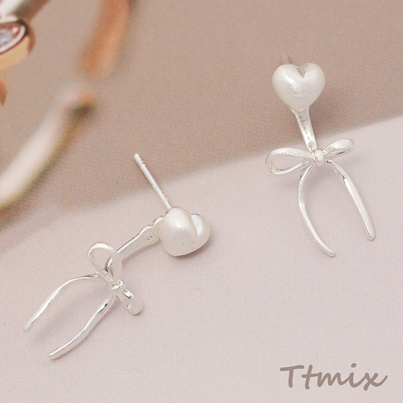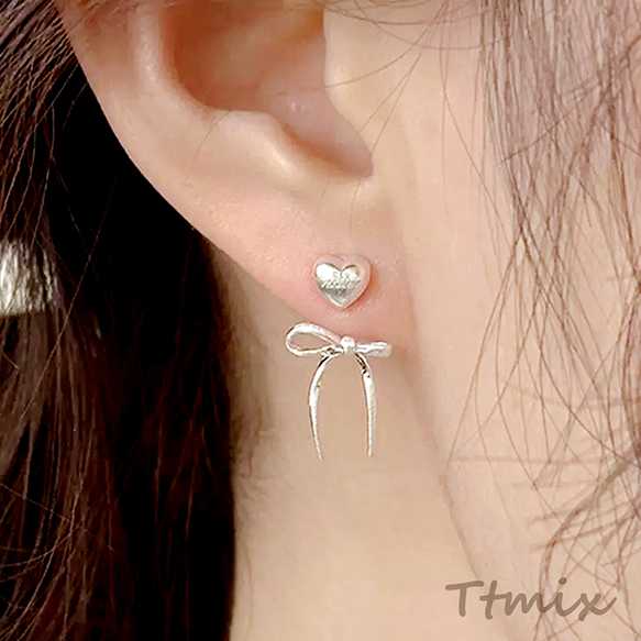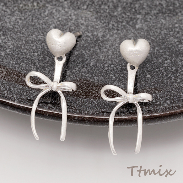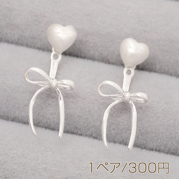 デザインピアス ぷっくり ハート 耳の後ろに取り付け可能なリボン飾り付き メタルピアス 約10×24mm(1ペア)