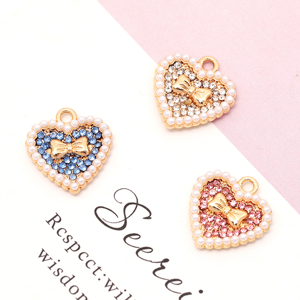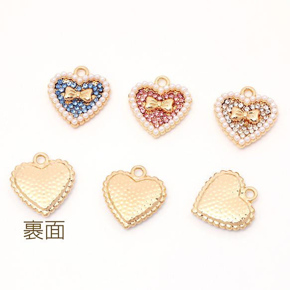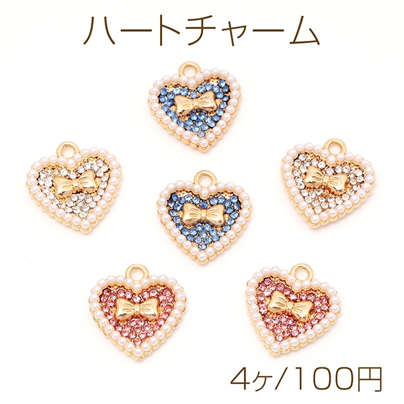 ハートチャーム リボン パール&ラインストーン キラキラ メタルチャーム 約16×17mm(4ヶ)