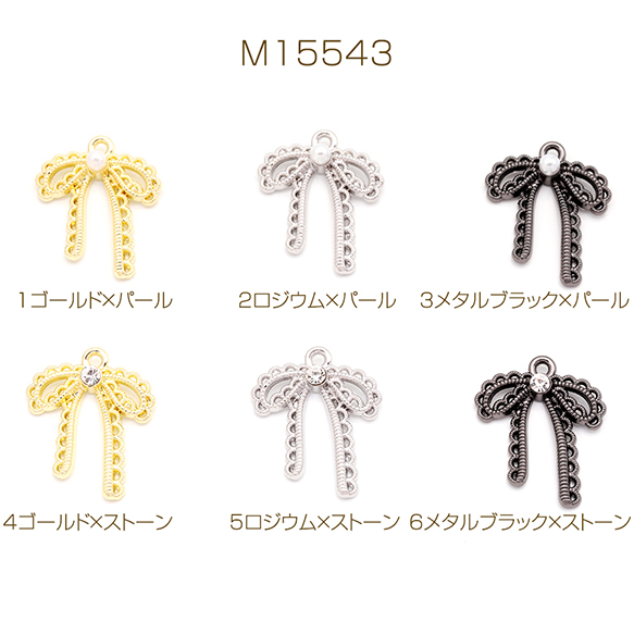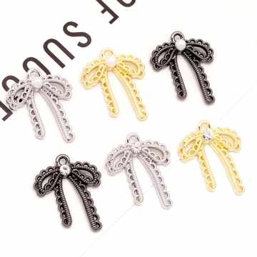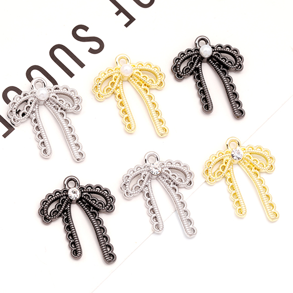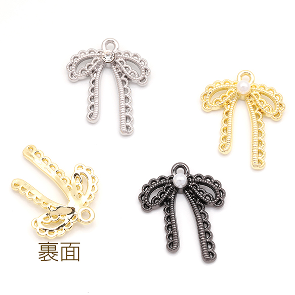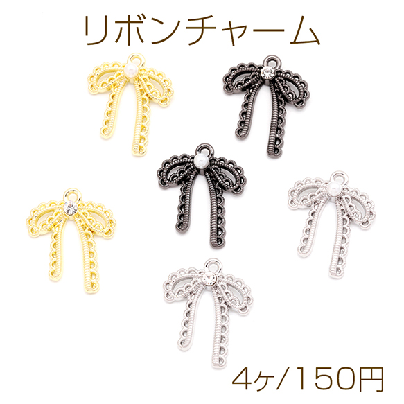 リボンチャーム 蝶々結び レース編み風 ABSパール ストーン付き メタルチャーム 約20×25mm(4ヶ)