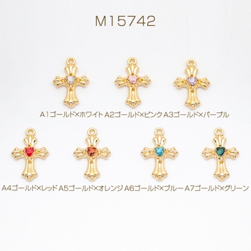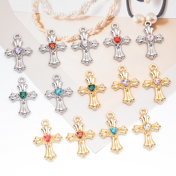 クロスチャーム カラフル 十字架 ハートのストーン付き クロス模様入り 立体 メタルチャーム 約20×30mm(1ヶ)