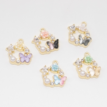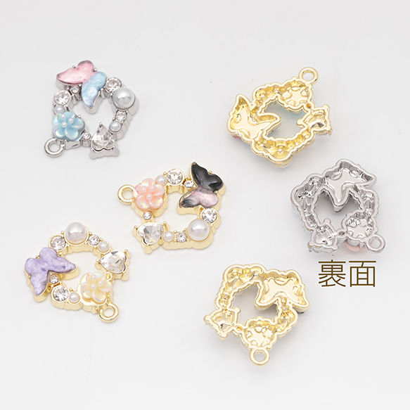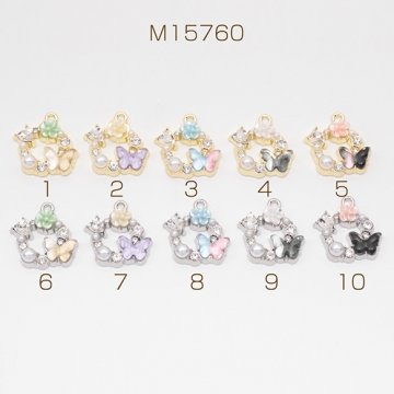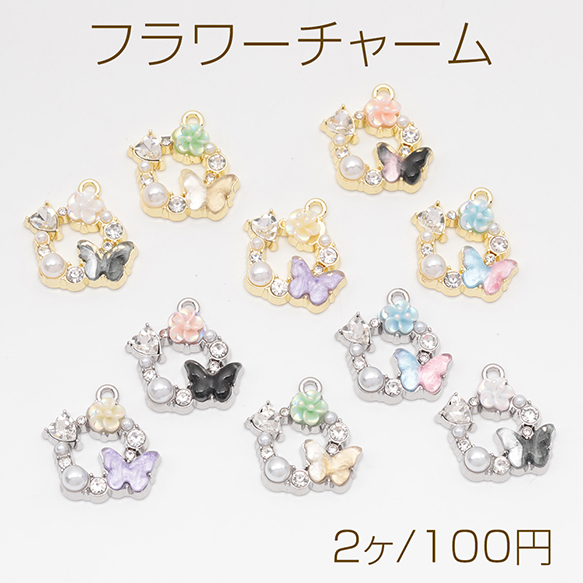 フラワーチャーム リース 蝶々 お花 パール/ストーン付き メタルチャーム 約19×19mm(2ヶ)