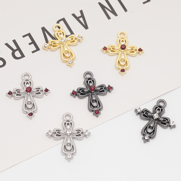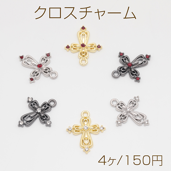 クロスチャーム 十字架 ストーン付き 半面 デザインチャーム メタルチャーム 約18×22mm(4ヶ)