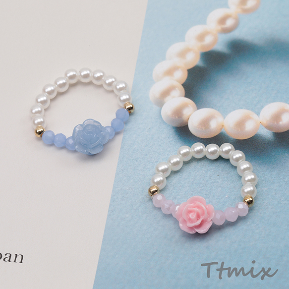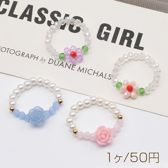ビーズリング フラワー ガラスビーズ 手作り キュート 可愛い ゴム 伸縮 指輪(1ヶ)※サービス品のため返品不可