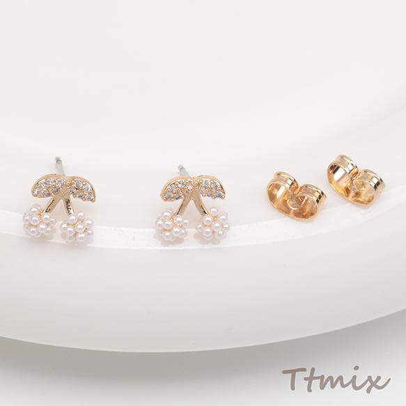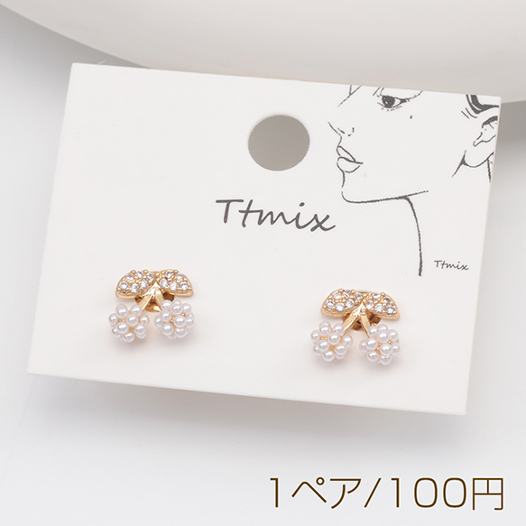 デザインピアス さくらんぼ フルーツ ABSパール&ラインストーン付き スタッドピアス 約7×8mm(1ペア)
