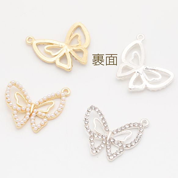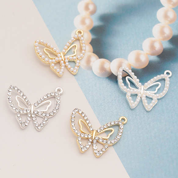 蝶チャーム ちょうちょ 蝶々 バタフライ ジルコニア ラインストーン/ABSパール メタルチャーム 約21×24mm(4ヶ)