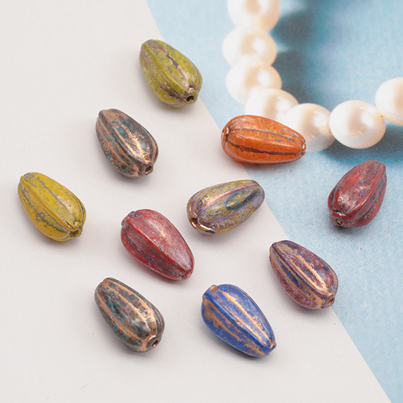 チェコ調ガラスビーズ かぼちゃ型 ドロップメロン チェコガラス風 アンティーク風 カラーランダム 約8×13mm(10ヶ)