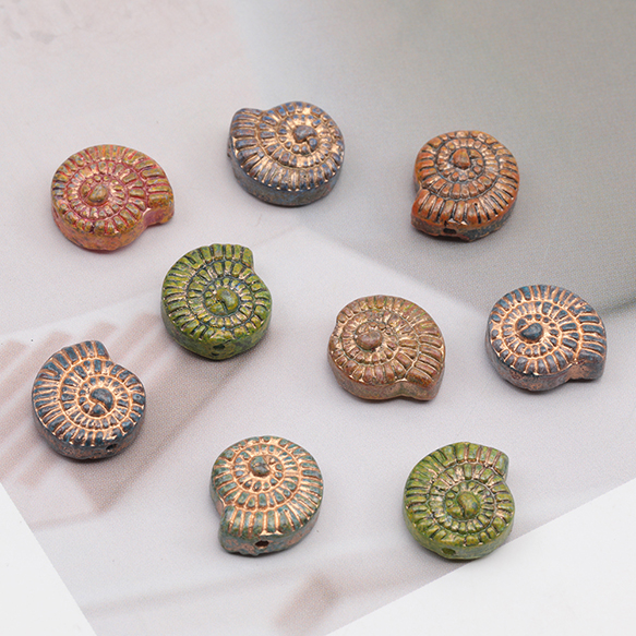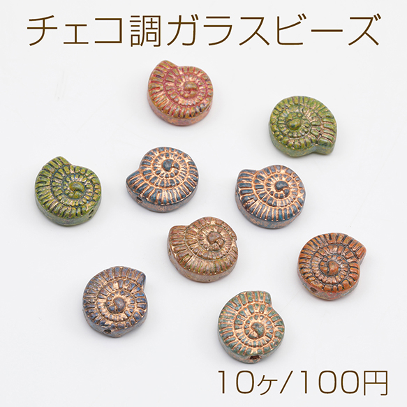 チェコ調ガラスビーズ アンモナイト シェル型 貝 チェコガラス風 アンティーク風 カラーランダム 約12×13mm(10ヶ)