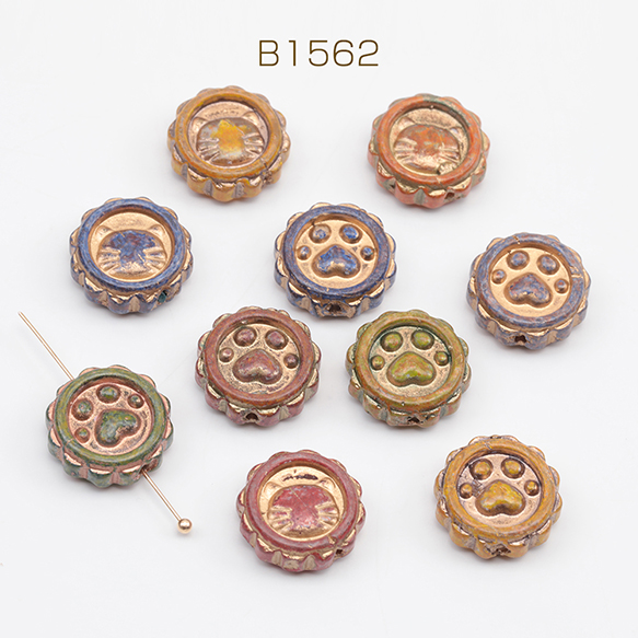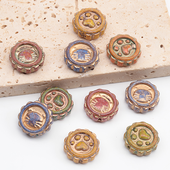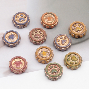 チェコ調ガラスビーズ 猫と肉球 コイン型 チェコガラス風 アンティーク風 カラーランダム 約15mm(8ヶ)
