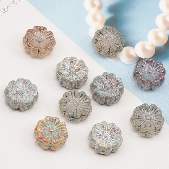チェコ調ガラスビーズ お花 花形 フラワービーズ チェコガラス風 アンティーク風 カラーランダム 約14mm(8ヶ)