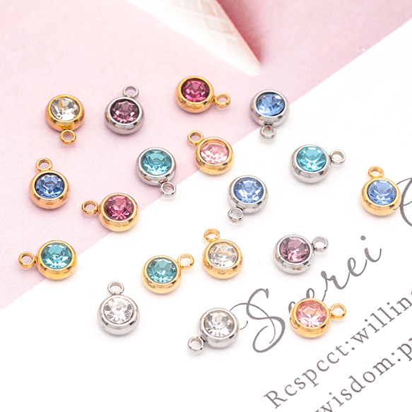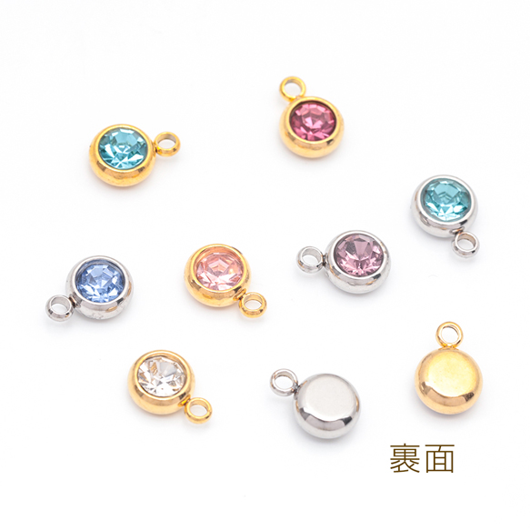 ステンレス製ガラスチャーム ラウンド カラーストーン付き 一粒 シンプル メタルチャーム 約6mm(4ヶ)