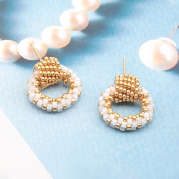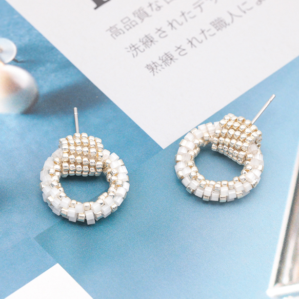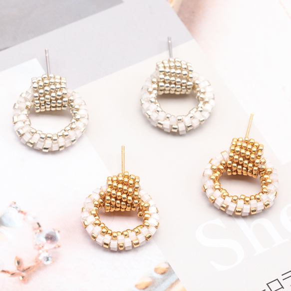 デザインピアス ラウンド ガラスビーズ 編みチャーム スタッドピアス メタルチャーム 約16×18mm(1ペア)