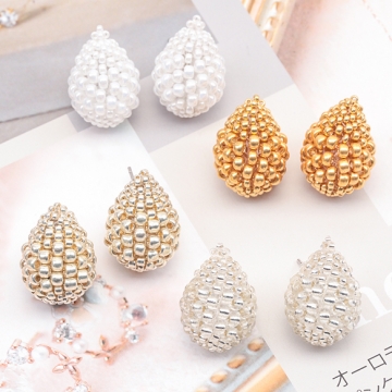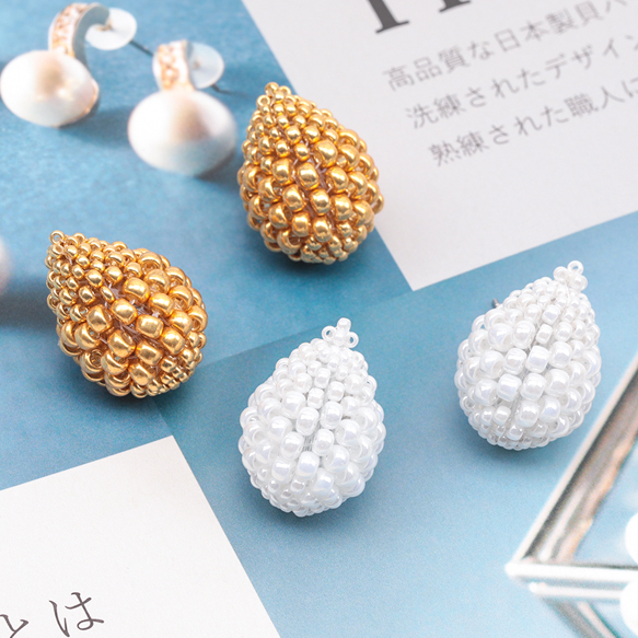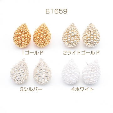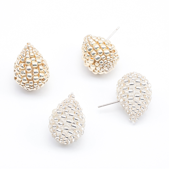 デザインピアス しずくモチーフ ガラスビーズ 編みチャーム スタッドピアス メタルチャーム 約15×22mm(1ペア)