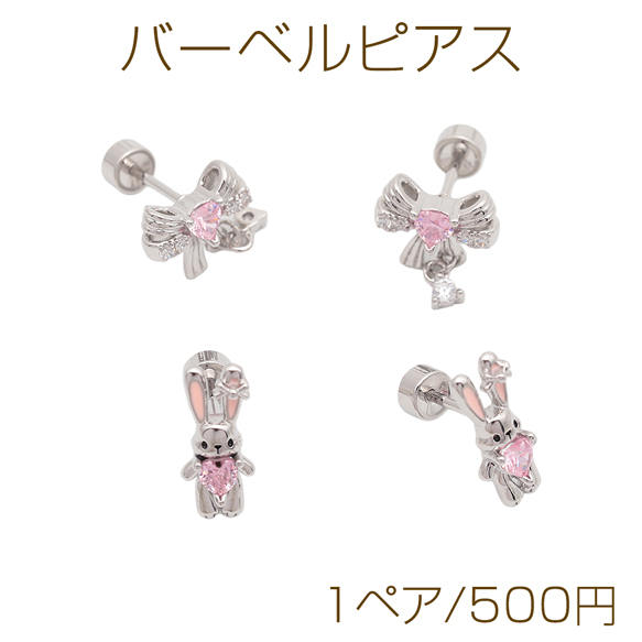 バーベルピアス リボン/うさぎ ピンクストーン付き ステンレス製 メッキ加工 デザインピアス 約8×10mm( 1ペア)