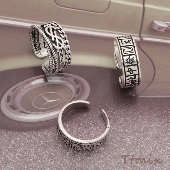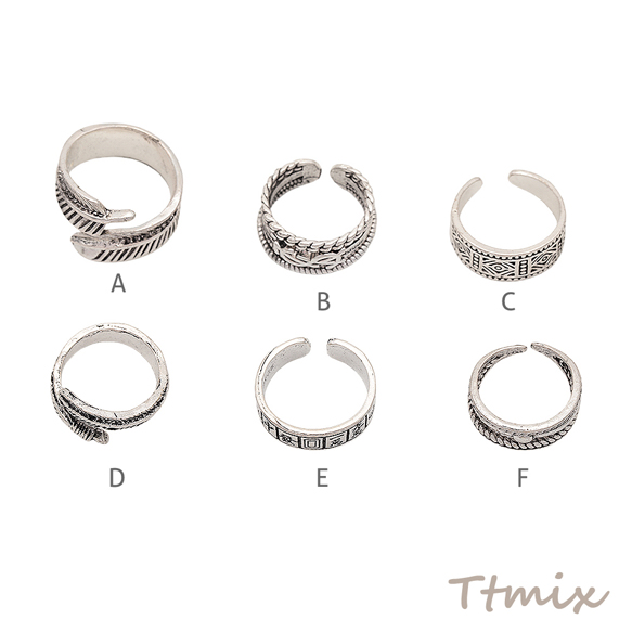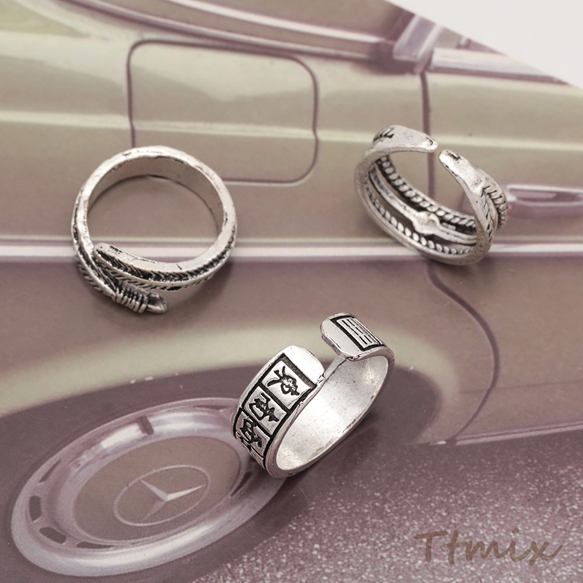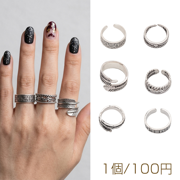 デザインリング フェザー 幾何学模様 ヴィンテージ風 アンティークシルバー メタルリング オープンリング 全6種(1個)