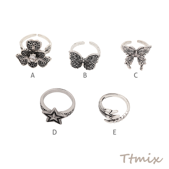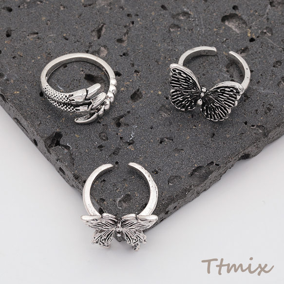 デザインリング フラワー 蝶 ヴィンテージ風 アンティークシルバー メタルリング オープンリング 全6種(1個)