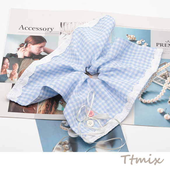 シュシュ ブルー カントリー風 スカーフリボン チェック模様 髪飾り 髪留め ヘアゴム ヘアアクセサリー(1ヶ)
