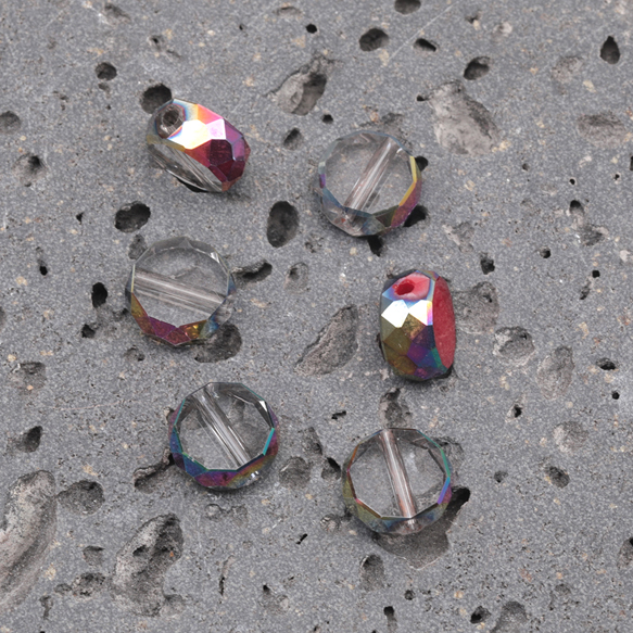 ガラスビーズ コイン型 レガラスビーズ コイン型 レッド/クリア オーロラメッキの縁 多面カット 研磨加工 フラットビーズ 約10mm(4ヶ)