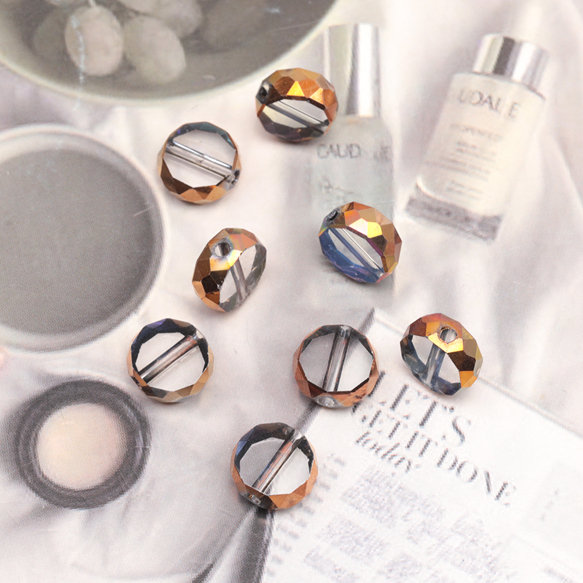 ガラスビーズ コイン型 クリア アンティークブロンズメッキの縁 多面カット 研磨加工 フラットビーズ 約10mm(4ヶ)