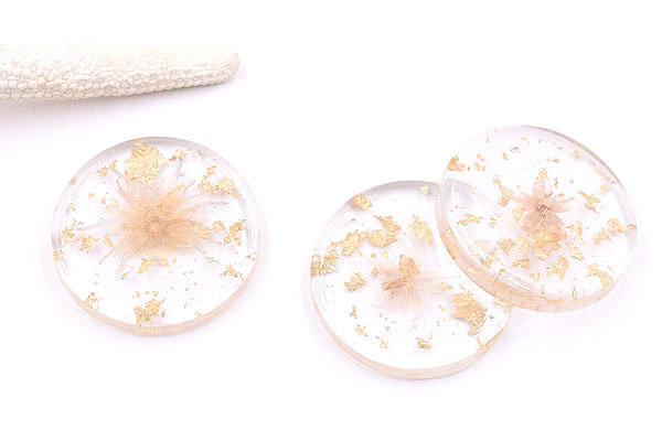 デコパーツ 樹脂コイン 38mm クリア ベージュのドライフラワーと金箔入り【2ヶ】