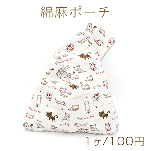 綿麻ポーチ かわいい猫【1ヶ】ネコポス不可